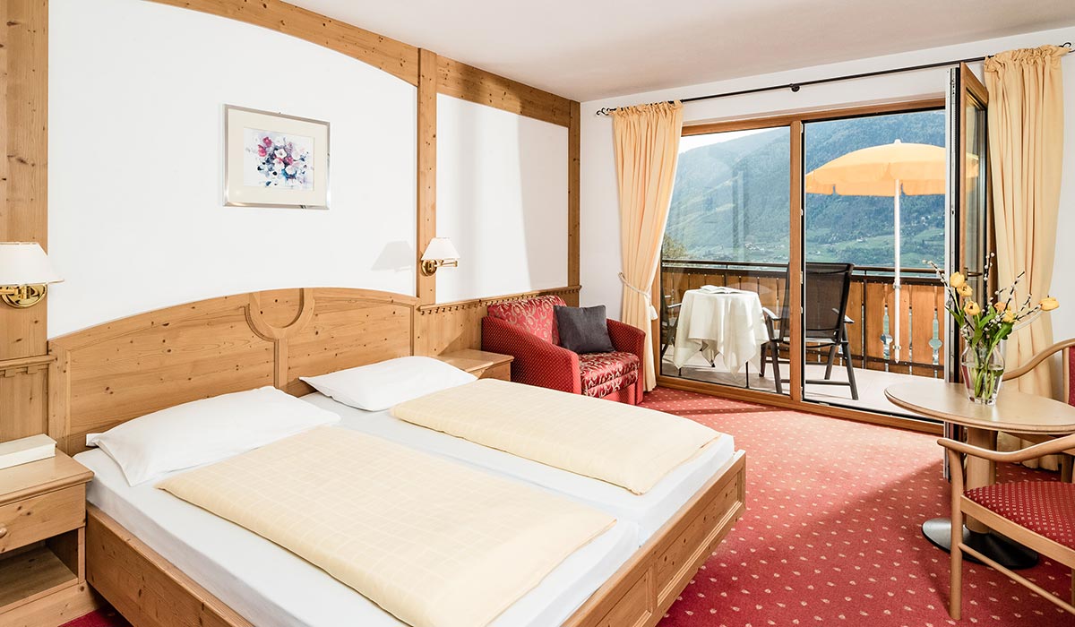Lato sud o sud-ovest al 1° o al 2°piano - ca. 26-30 m², camera doppia comfort con climatizzatore, eleganti letti «Boxspring», divanetto, doccia, WC, asciugacapelli, specchio trucco, telefono, radio con DAB, cassaforte, TV HD a schermo piatto, pavimento anallergico in look legno, balcone panoramico esposto a sud o sud-ovest con vista verso Merano/Lagundo, risp. Castel Tirolo e le montagne del Gruppo di Tessa