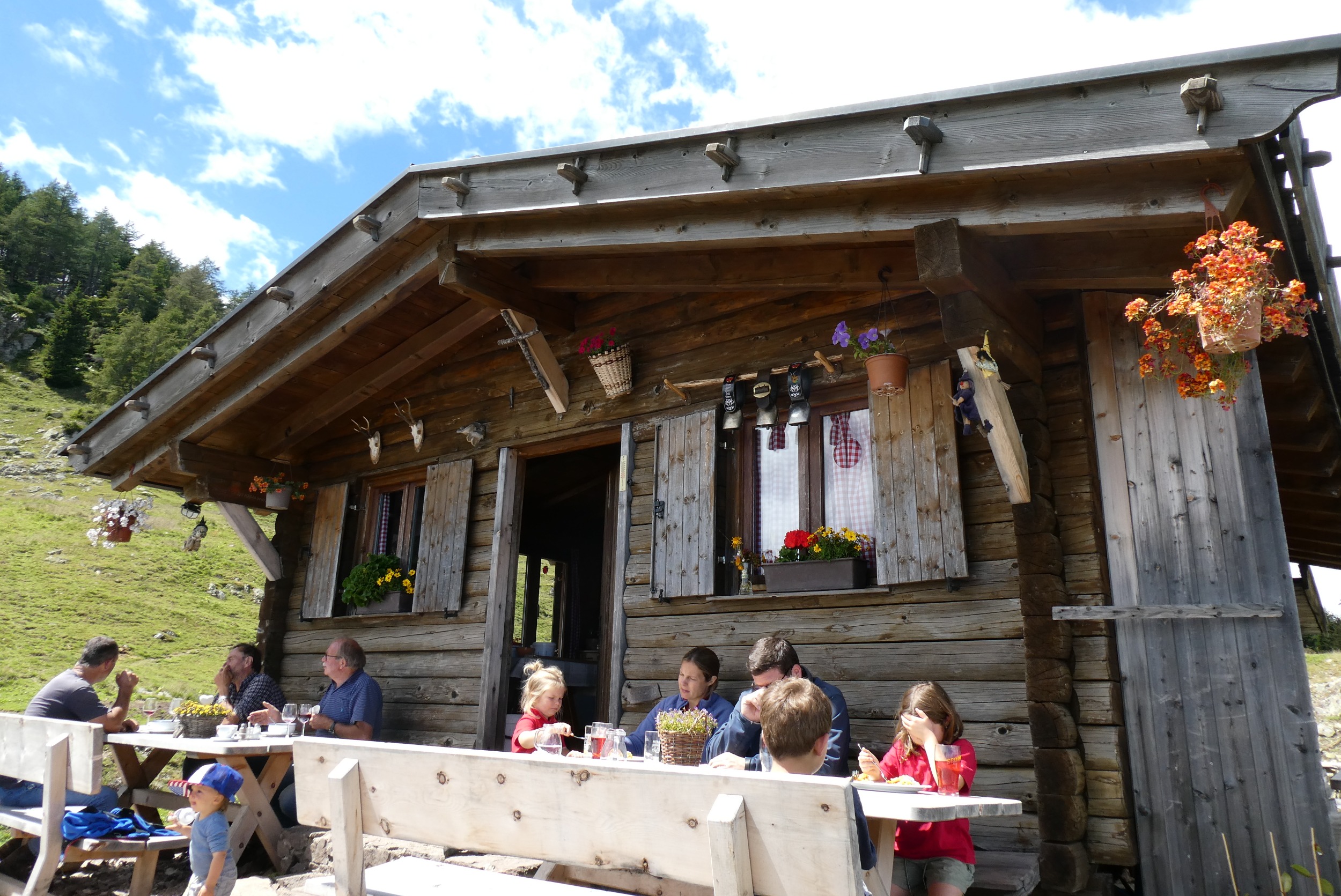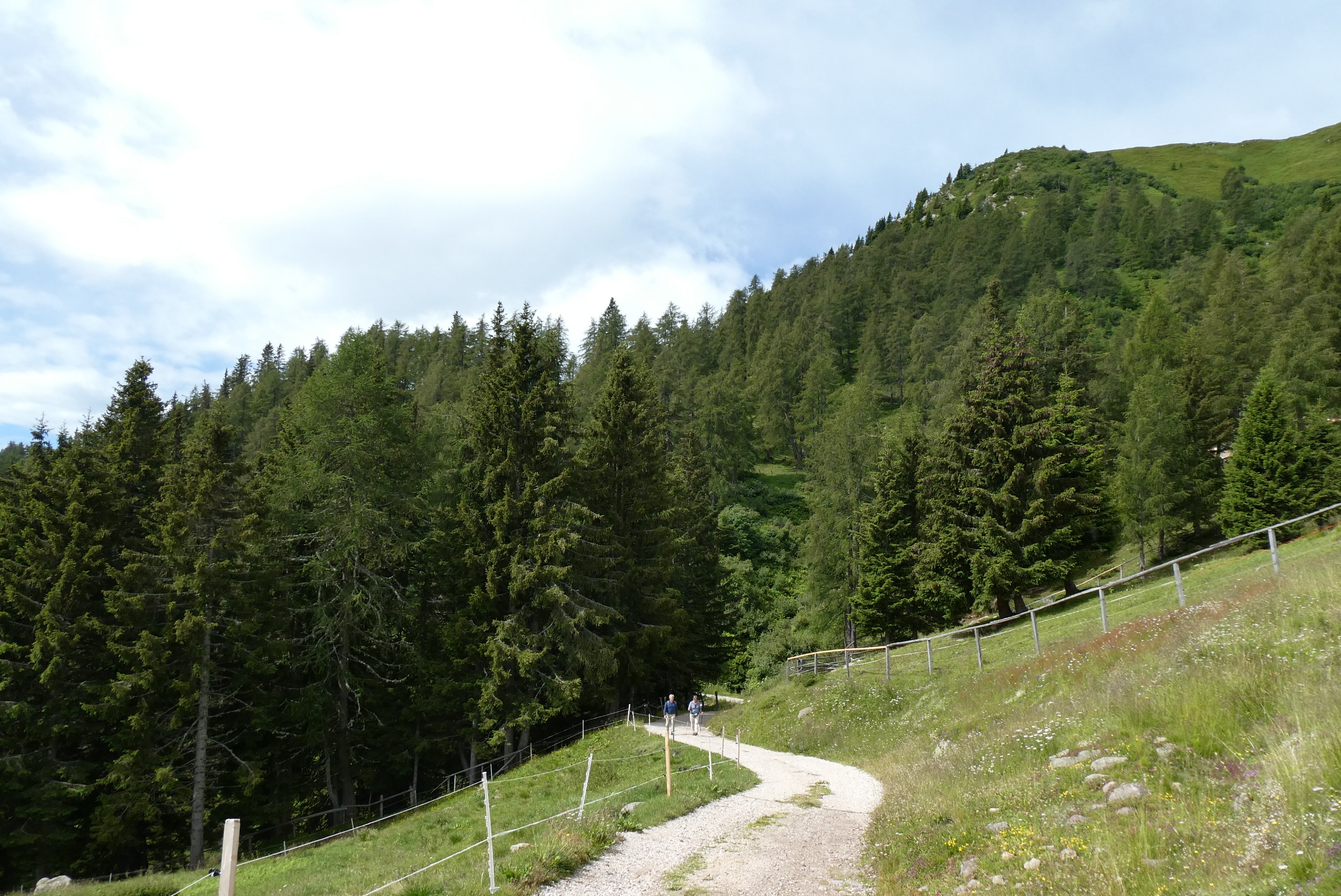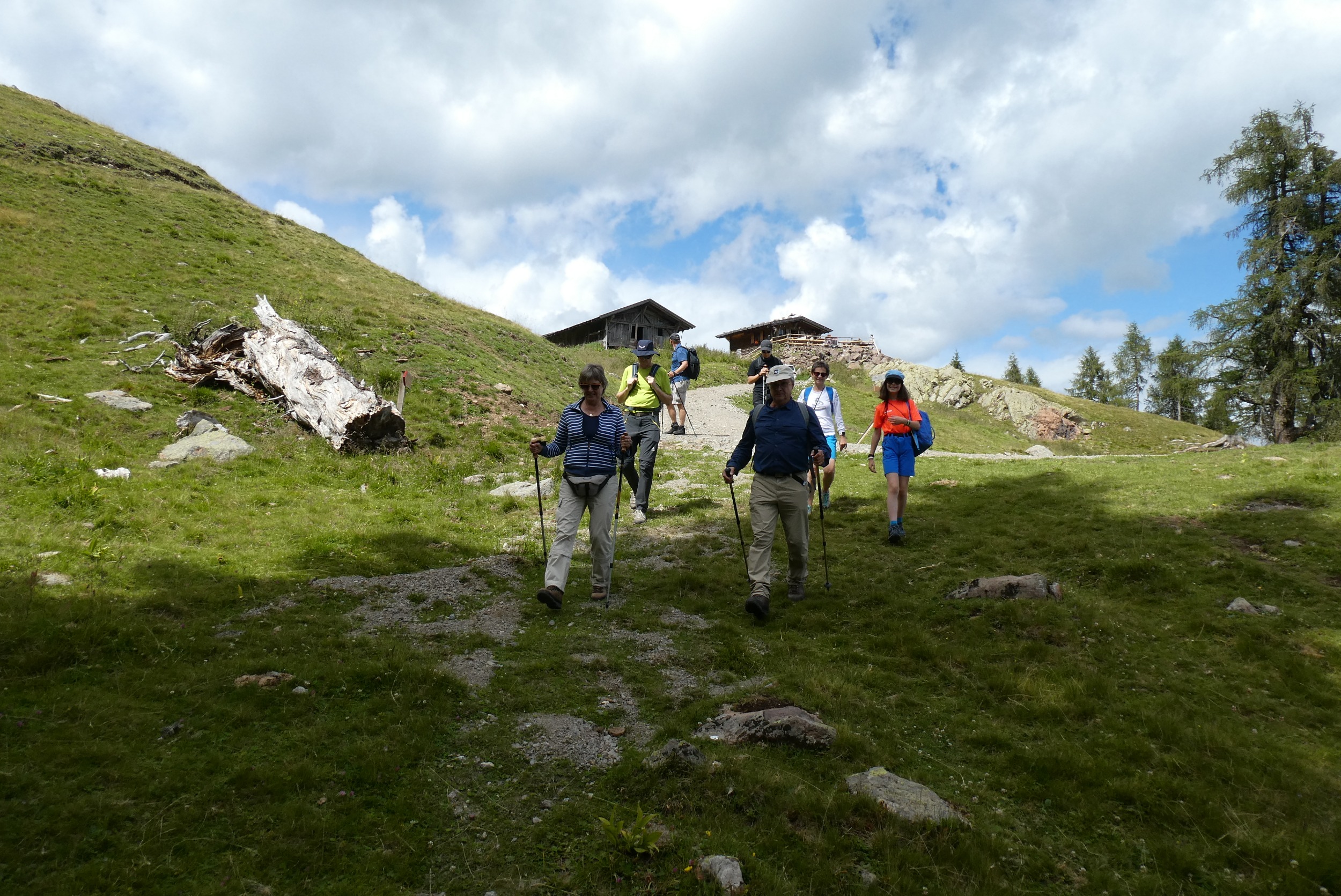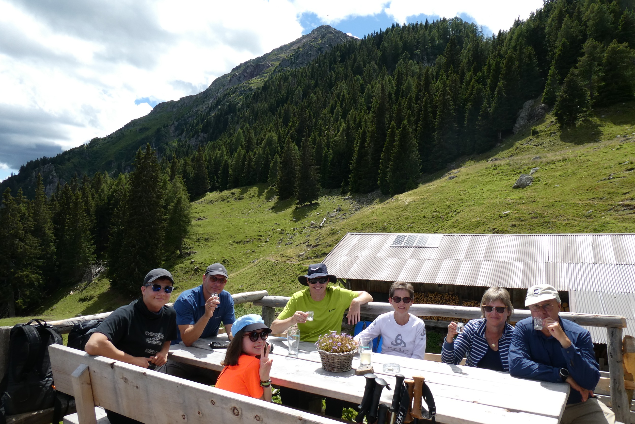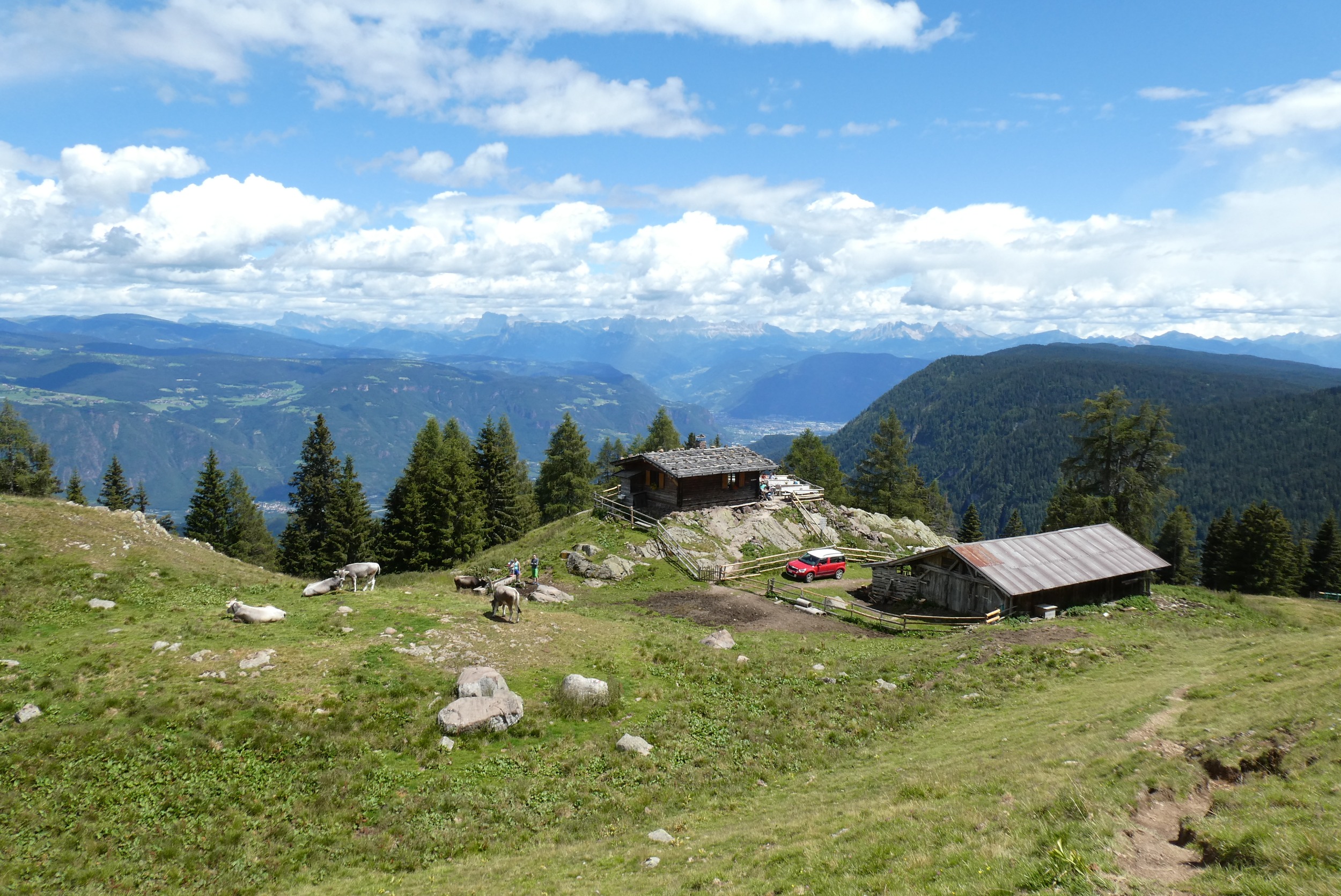 Danach ging es um den Gipfel herum, über das Geröllfeld und blühende Almmatten hinunter zur idyllischen Gfrillner Laugenalm. Sie liegt wunderschön mit einem atemberaubenden Blick auf das Etschtal und die Dolomiten. Zurück zum Parkplatz wanderten wir dann über einen Steig.