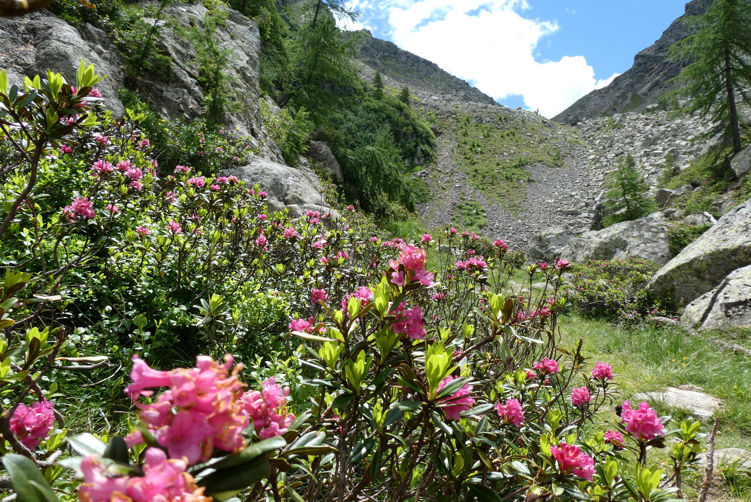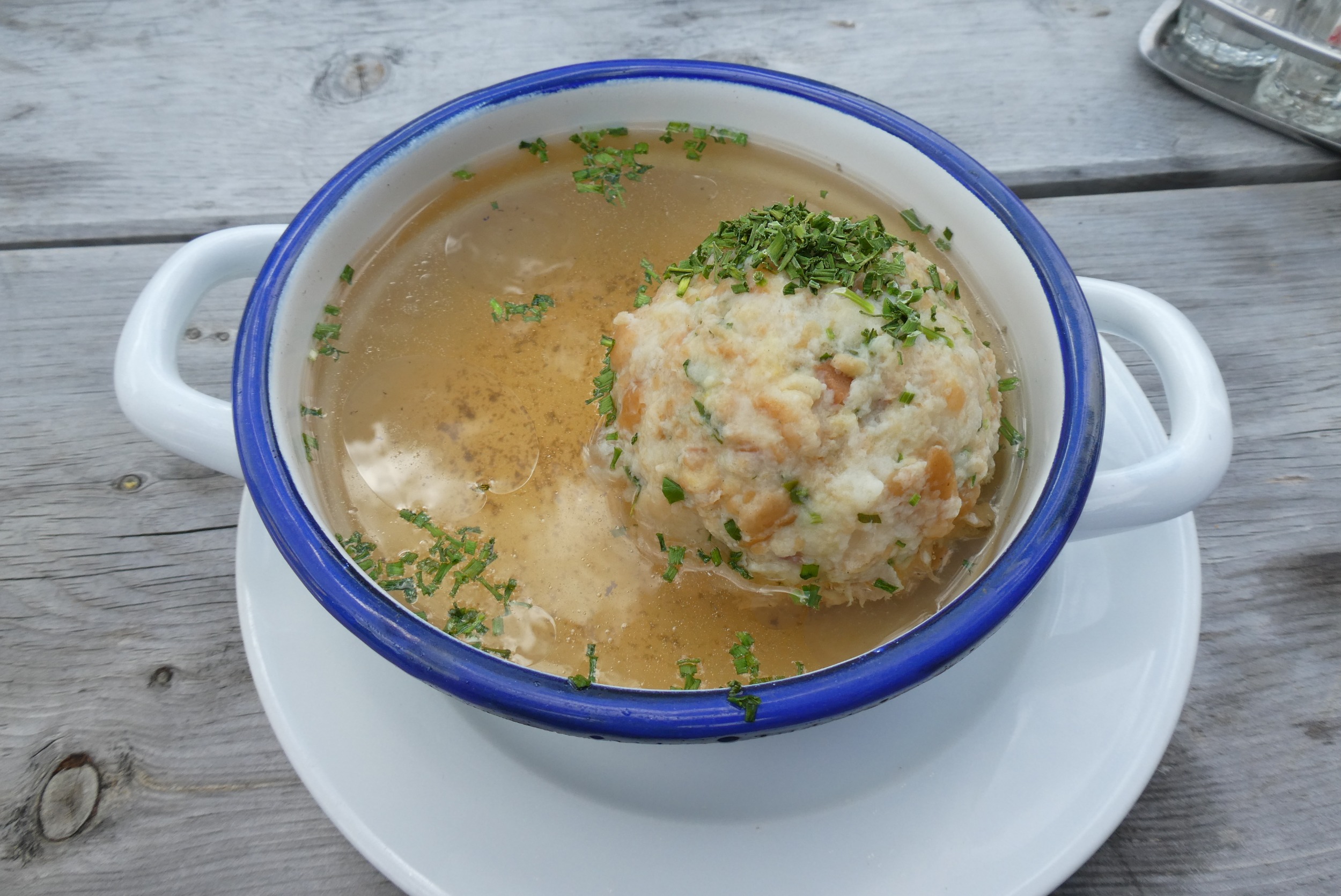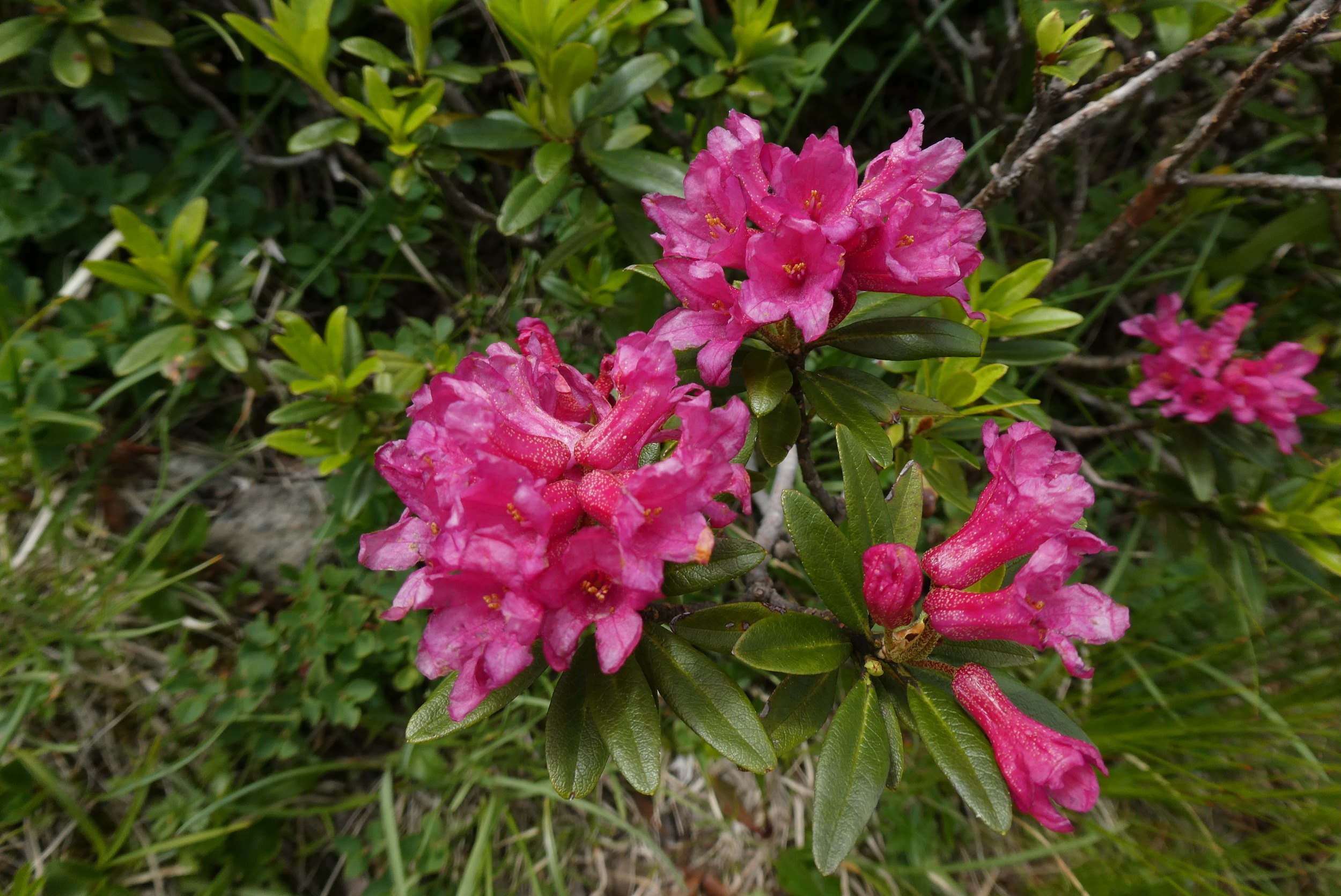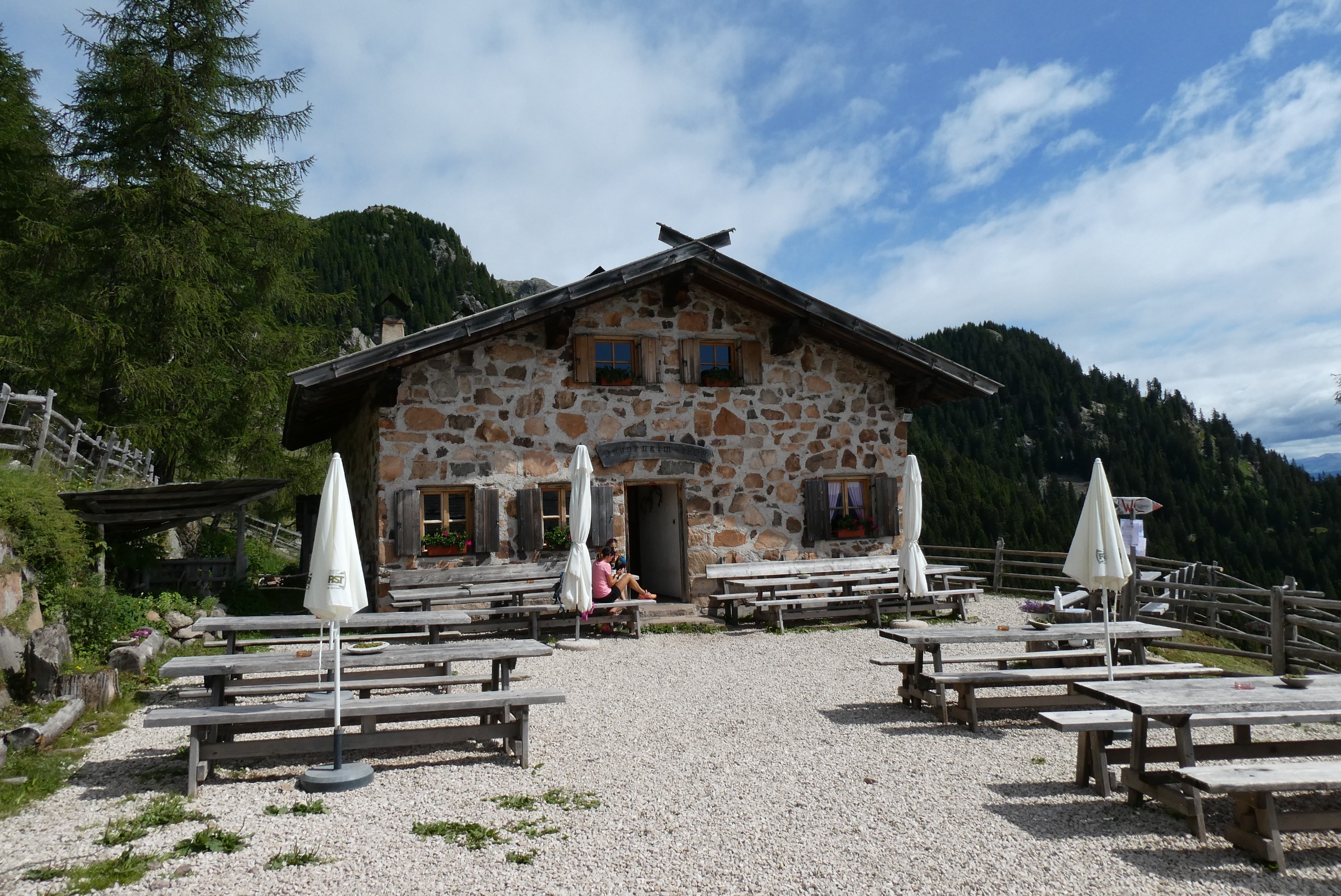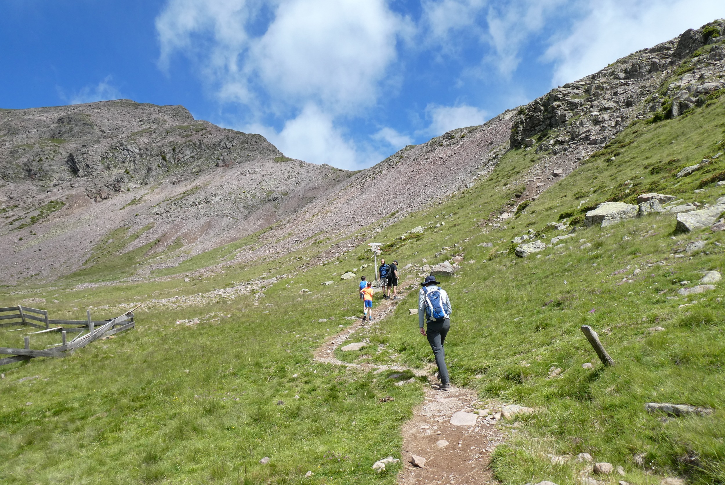 Danach ging es um den Gipfel herum, über das Geröllfeld und blühende Almmatten hinunter zur idyllischen Gfrillner Laugenalm. Sie liegt wunderschön mit einem atemberaubenden Blick auf das Etschtal und die Dolomiten. Zurück zum Parkplatz wanderten wir dann über einen Steig.