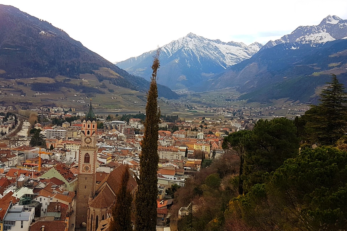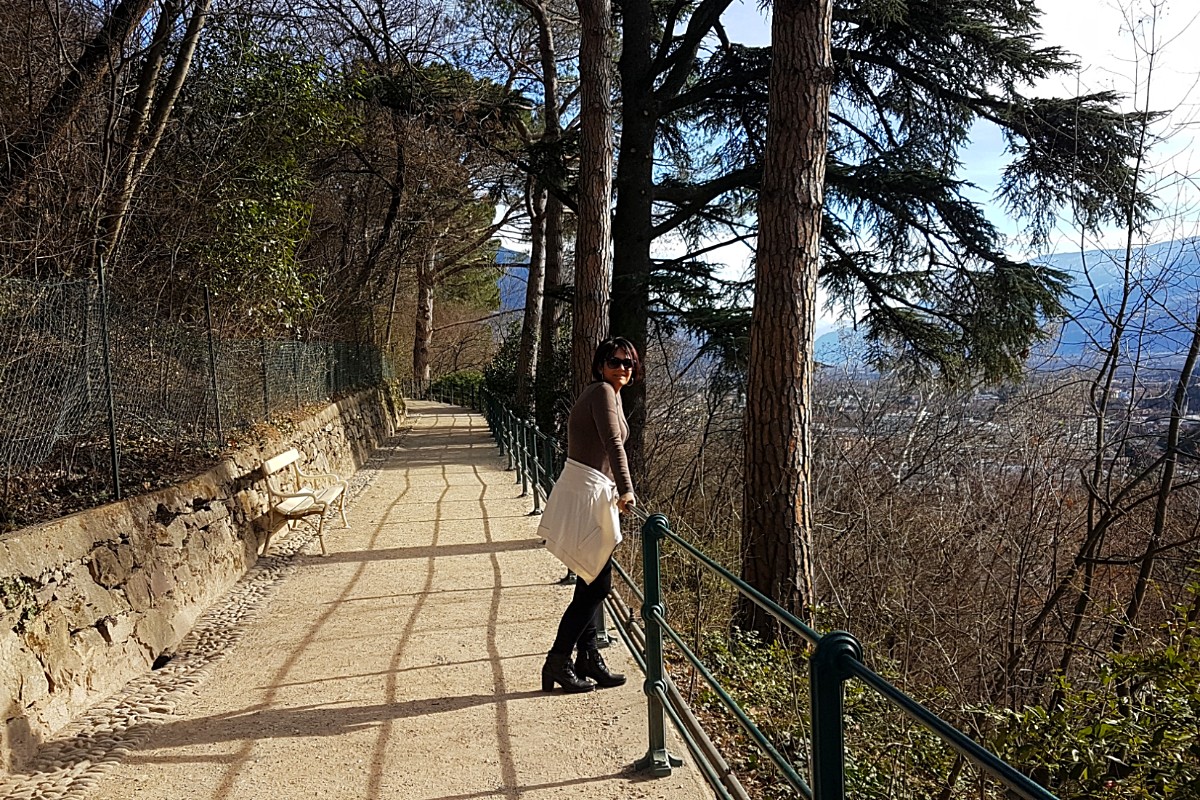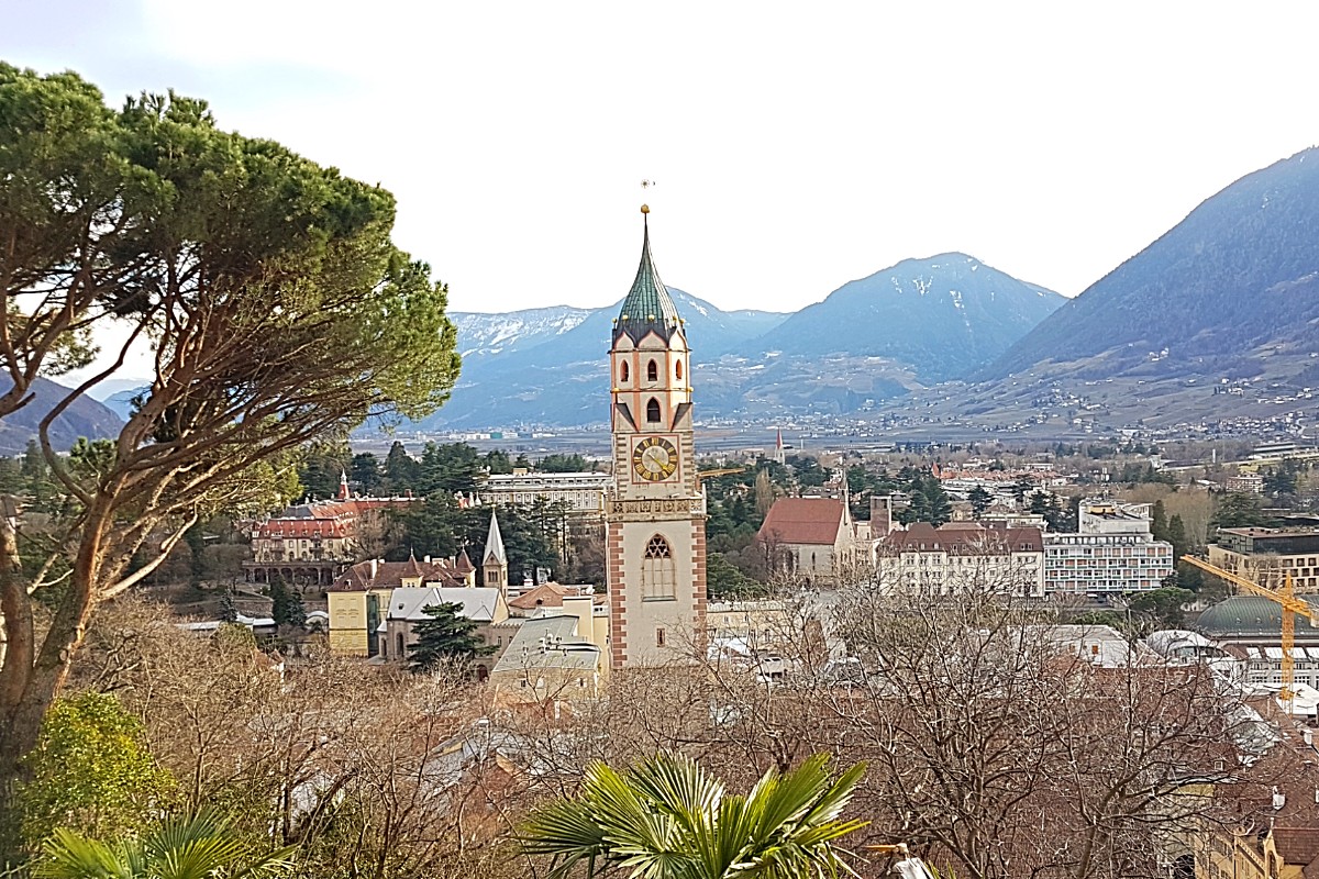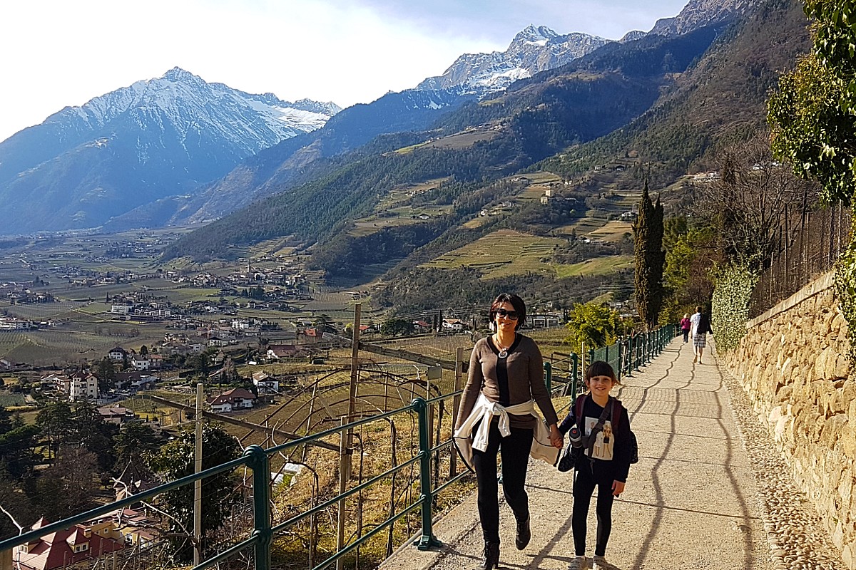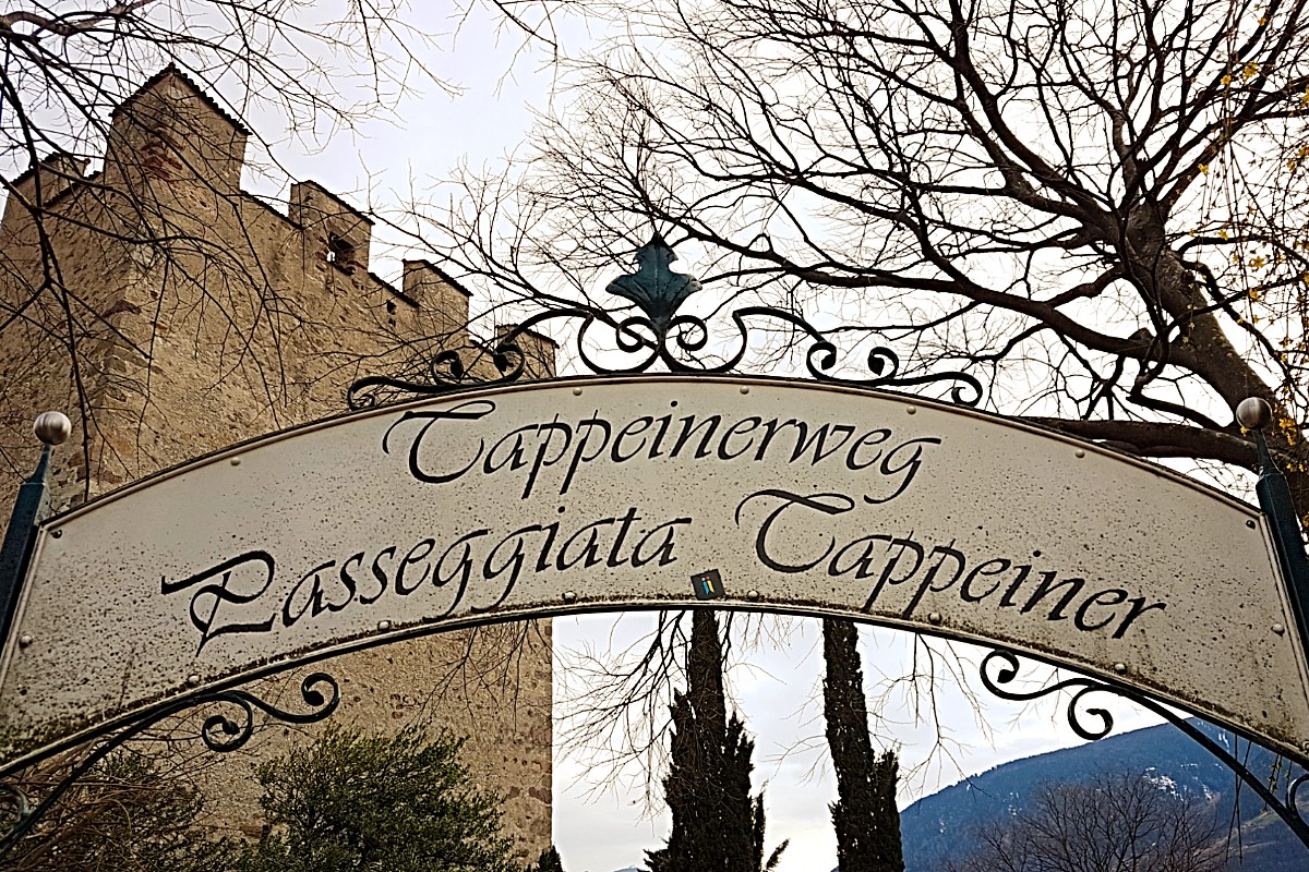 Über unsere Keschtngasse und weiter auf dem Gnaidweg ging es zum Eingang des bei unseren Gästen sehr beliebten Tappeinerweges. Diese wunderbar sonnige Promenade war bereits zu Kaisers Zeiten aufgrund ihrer mediterranen Vegetation bekannt. Sie führt eben, ca. 50 Höhenmeter über den Dächern von Meran, von Gratsch zum Pulverturm und weiter zur Gilfpromenade.